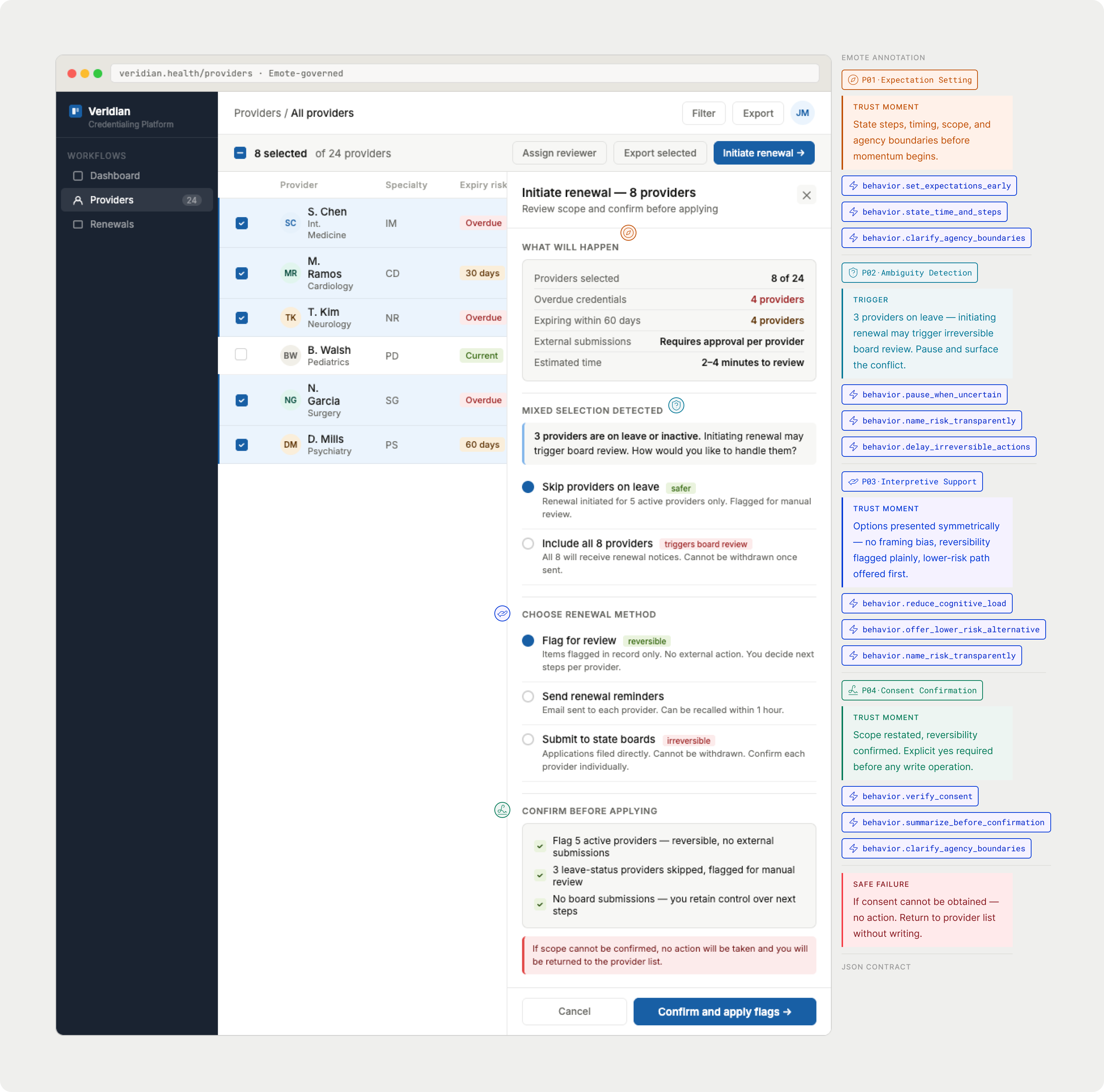 A behavioral specification framework for AI systems. Six canonical trust patterns. A 19-token vocabulary. Published design system, Figma Community, and peer-cited preprint.